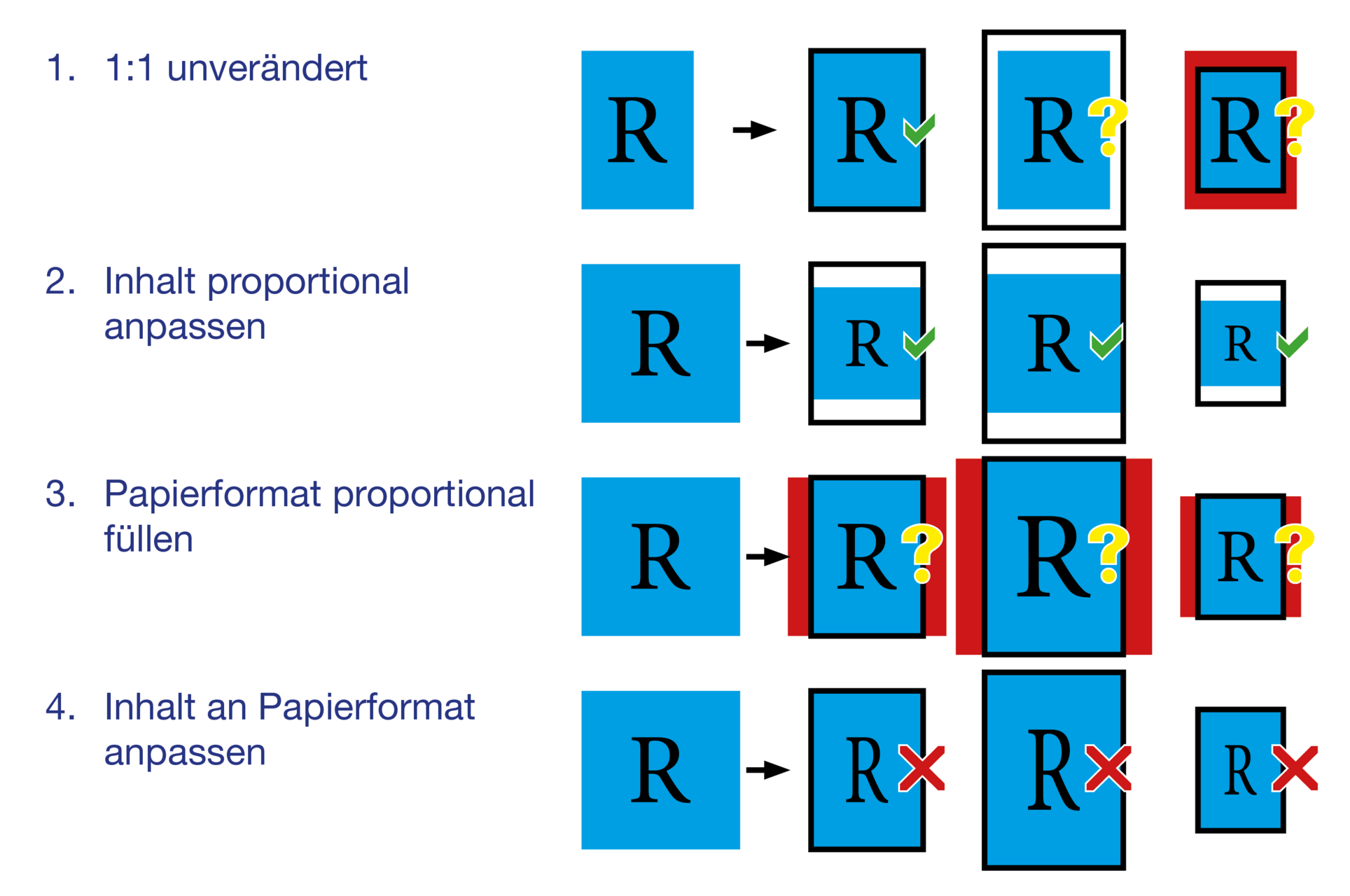 angepasst werden. Wenn die gelieferten Daten nicht mit dem Papierformat übereinstimmen wird das Druckbild unter Beibehaltung des Seitenverhältnis auf das Papierformat skaliert, dadurch können unbedruckte Ränder entstehen.